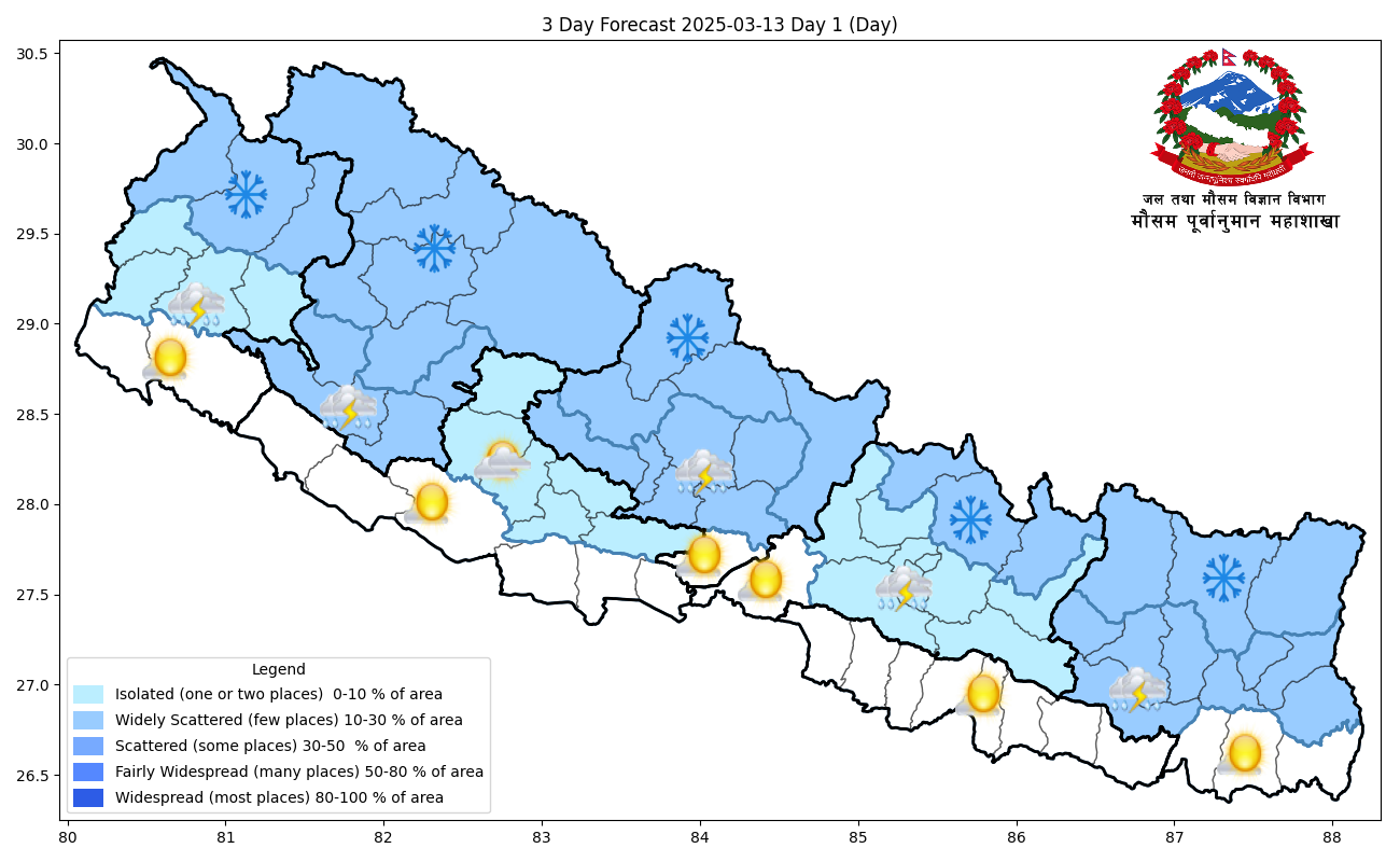 त्यसैगरी, आज राति देशका पहाडी भू–भागमा आंशिकदेखि साधारणतया बदली हुने छ भने बाँकी भू–भागमा मुख्यतया मौसम सफा रहनेछ । कोशी, गण्डकी र कर्णाली प्रदेशका उच्च पहाडी तथा हिमाली भू–भागका एक–दुई स्थानमा हल्का हिमपातको सम्भावना छ ।