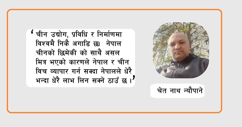 चीन उद्योग, प्रविधि र निर्माणमा विश्वमै निकै अगाडि छ। नेपाल चीनको छिमेकी को साथै असल मित्र भएको कारणले नेपाल र चीन विच व्यापार गर्न सक्दा नेपालले धेरै भन्दा धेरै लाभ लिन सक्ने ठाउँ छ ।