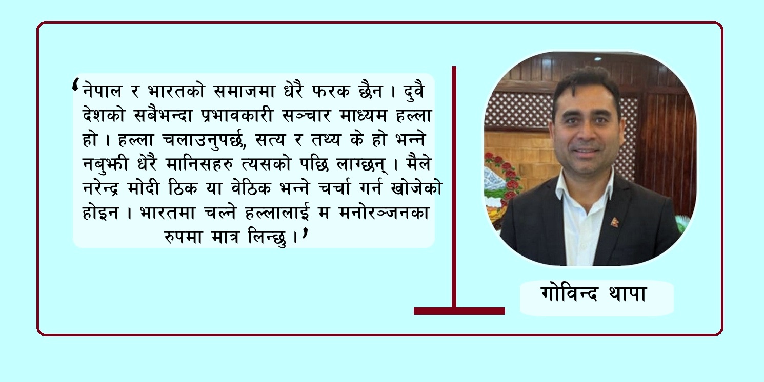 नेपाल र भारतको समाजमा धेरै फरक छैन । दुवै देशको सबैभन्दा प्रभावकारी सञ्चार माध्यम हल्ला हो । हल्ला चलाउनुपर्छ, सत्य र तथ्य के हो भन्ने नबुझी धेरै मानिसहरु त्यसको पछि लाग्छन् । मैले नरेन्द्र मोदी ठिक या वेठिक भन्ने चर्चा गर्न खोजेको होइन भारतमा चल्ने हल्लालाई म मनोरञ्जनका रुपमा मात्र लिन्छु ।