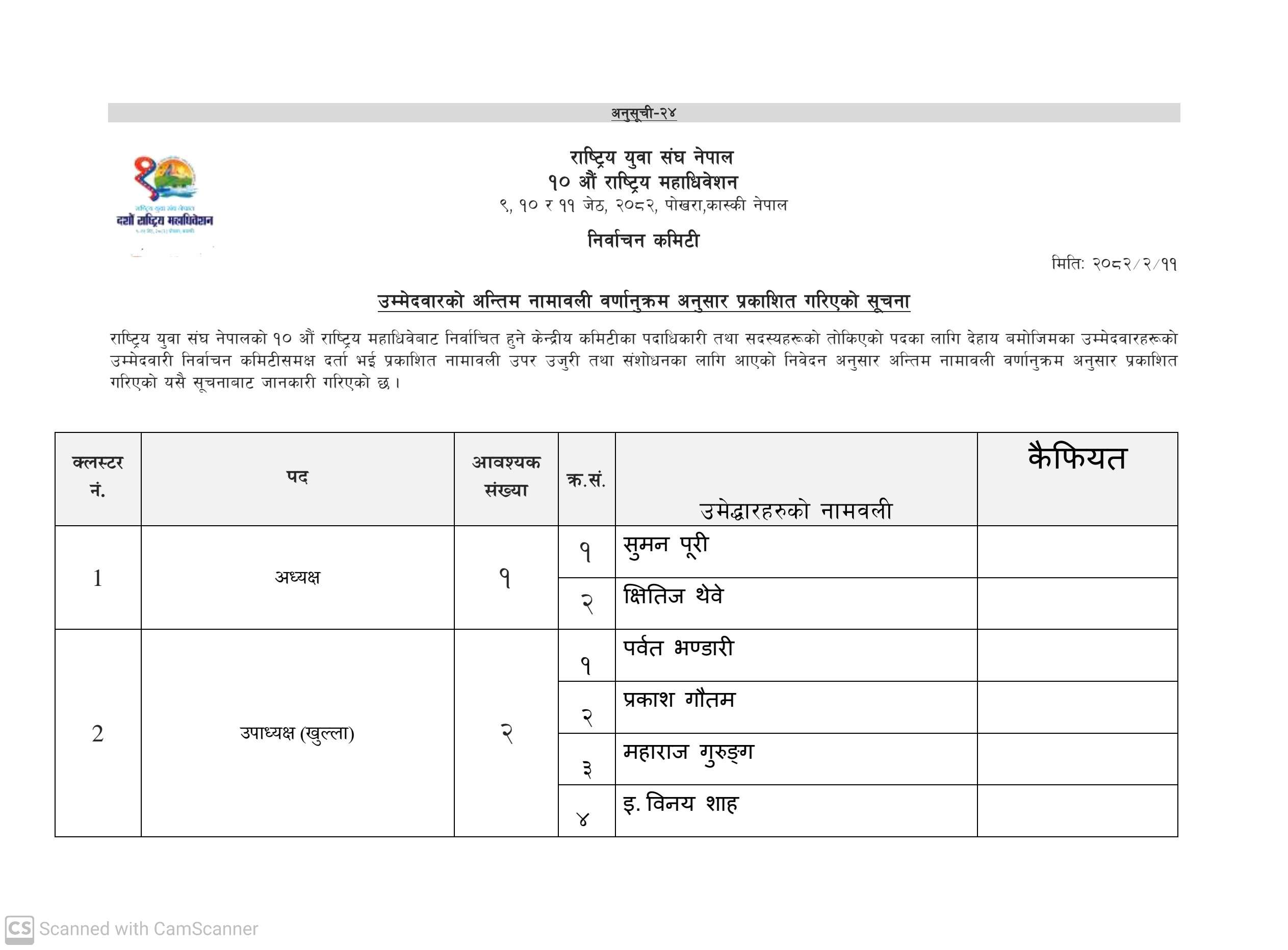 पोखरा । पोखरामा जारी राष्ट्रिय युवा संघ नेपालको दशौं महाधिवेशन अन्तर्गत निर्वाचित हुने १५१ सदस्यीय केन्द्रीय समिति मध्ये ४० प्रतिशत सदस्यहरू सर्वसम्मत रूपमा चयन भएका छन्। तीमध्ये अधिकांश क्षितिज थेबे पक्षधर रहेको देखिएको छ।