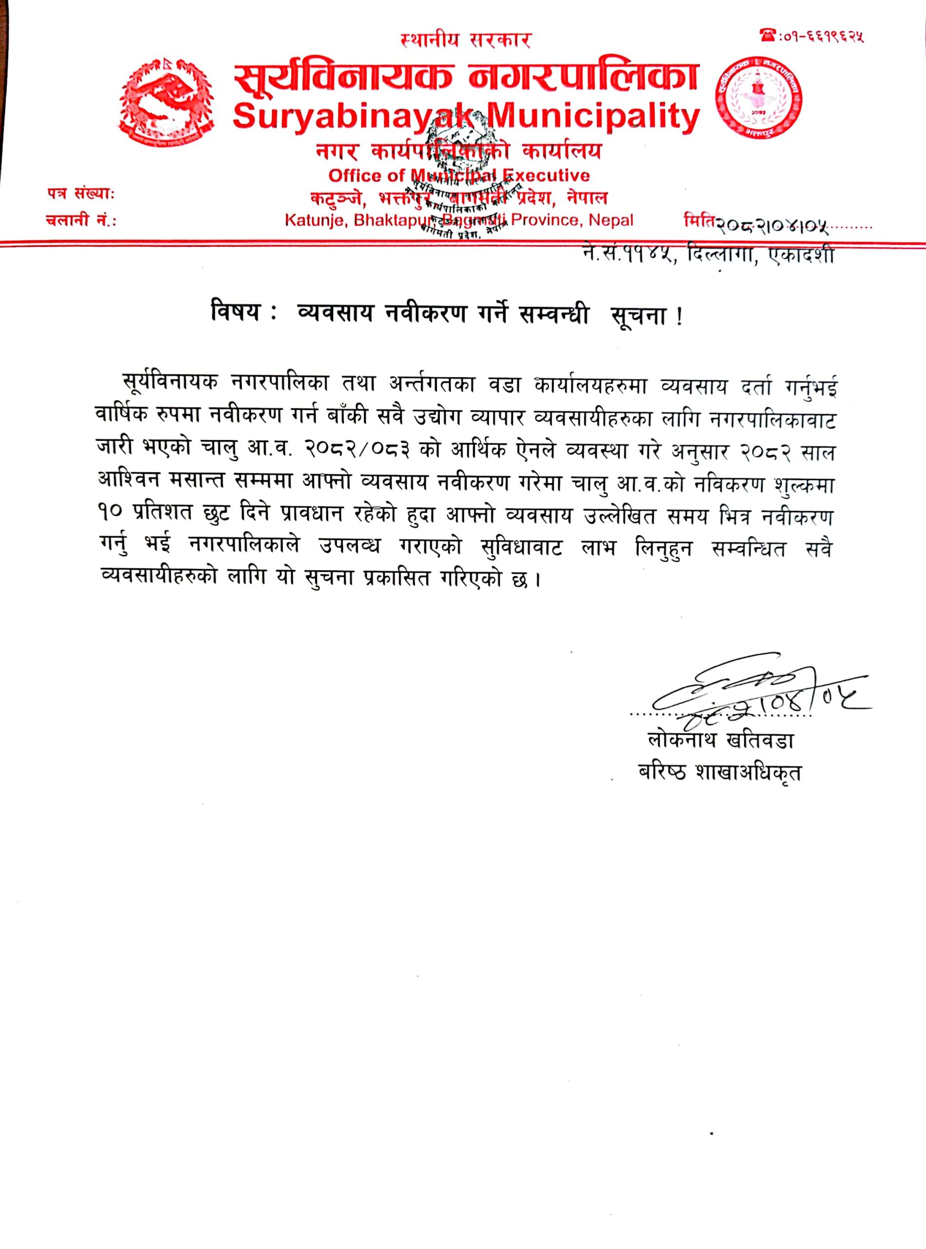 सूर्यविनायक नगरपालिकामा व्यवसाय नवीकरण गर्न आह्वान