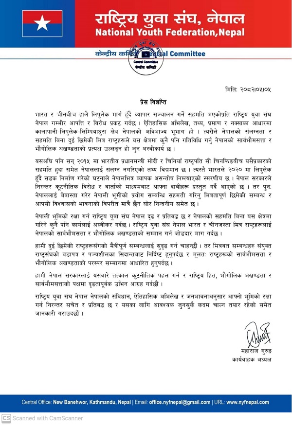 लिपुलेक सम्झौताप्रति राष्ट्रिय युवा संघ नेपालको कडा आपत्ति